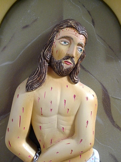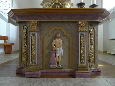 Der Hochaltar aus Holz beherbergt eine etwas ältere Holzfigur einer Mutter Gottes mit dem Kinde. Holzfiguren der Heiligen Remigius und Rochus, wohl beide von einem Altar des 17. Jahrhundert. [2]