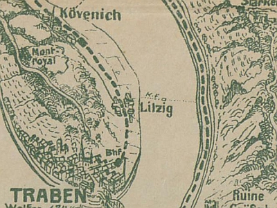 Bei der Post- oder Ports-Wiese, am Fuße des Felsens, auf welcher die Starkenburg thronte, von wo seit Jahrhunderten die Fähre von Starkenburg nach Litzig führt und wo das Bett der Mosel sich verengt [1]