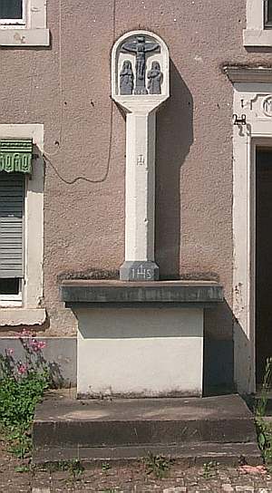 Am Kreuzfuss 1626 datierter Schaftbildstock auf einem späteren Altarblock. [1]