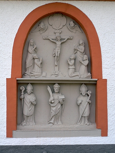 Unter einer Kruzifixscene mit Maria und Johannes kniet der Stifter und seine Angehörigen, alles große Figuren in Relief. Im veränderten Aufbau 72 cm hohe, fast vollfigürliche Reliefs der hhl. Apostel Bartholomäus, Bischof Servatius (?) und Stephanus. [2]