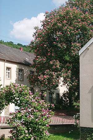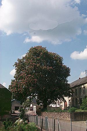 Vor dem Haus riesige rotblühende Kastanie als Hausbaum. [1]
