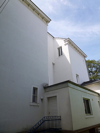 Repräsentativer kubischer Neurenaissancebau mit flachen Walmdächern, zwei Nebengebäude. [1]