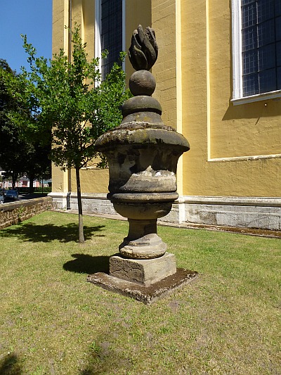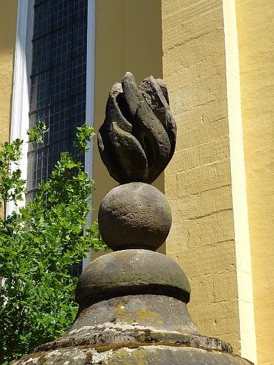 Im ummauerten Garten an der Südseite der Kirche [...] eine große sandsteinerne Flammenvase, vom Turm der Kirche stammend. [1]