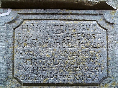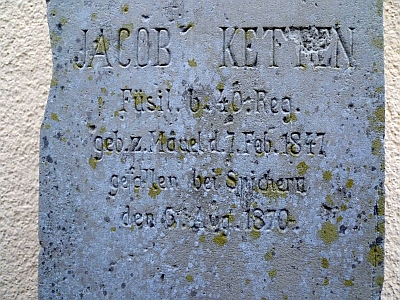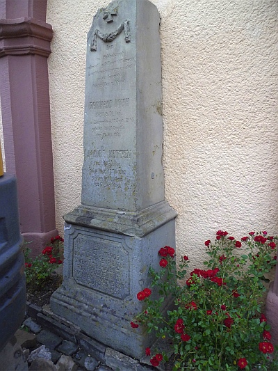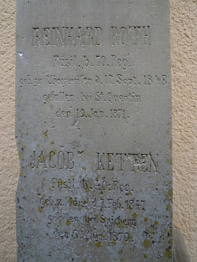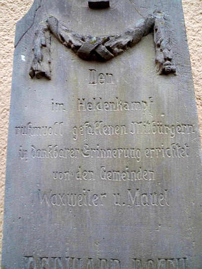 Das Kriegerehrenmal von 1870/71 wurde für die im Deutsch-französischen Krieg gefallenen Reinhard Roth aus Waxweiler und Jakob Ketten aus Mauel errichtet. Der kleine Obelisk steht heute auf dem ehemaligen Sockel des Bußkreuzes mit der Inschrift für den am 29.04.1788 verstorbenen Oberst Johann Heinrich de Niesen. Zur Erklärung: Von 1755-1799 war Johann Jacob Niesen (* 1723 in Trier, † am 02.11.1812 in Schönecken) Pfarrer in Waxweiler. Im Jahr 1788 verstarb in Waxweiler sein Verwandter, Colonel Heinrich Johann de Niesen. Der Pfarrer suchte nach einem würdigen Grab und das Bußkreuz mit dem Sockel wurde zum Denkstein des toten Soldaten. Das Kreuz wurde in den Schutz des Kirchturmes versetzt und bekam eine Inschrift für den am 29.04.1788 verstorbenen Oberst Johann Heinrich de Niesen. Später trennte man den Sockel vom Bußkreuz, welches an den zugemauerten Westeingang der Pfarrkirche versetzt wurde. Heute steht das Bußkreuz an der Ostseite der Kirche, an einem zugemauerten Eingang zum Ostchor. Der Sockel mit der Inschrift trägt heute das Kriegerehrenmal von 1870/71 und steht mit diesem am früheren Westeingang der Pfarrkirche. [1]