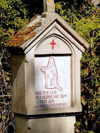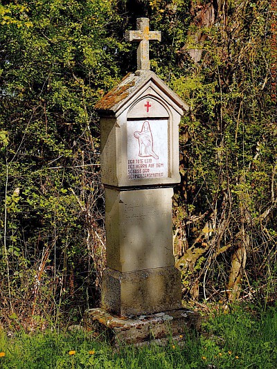 Entlang des auf die südliche Anhöhe führenden Bergweges und am Saum zum westlich davon gelegenen Weinberg stehende Kreuzweganlage von 1913. Vierzehn schlichte Sandsteinstationen, jeweils aus glattem Schaft, verdachtem Aufsatz und Abschlußkreuz; die Darstellungen neu. [1]