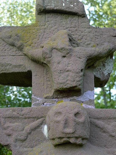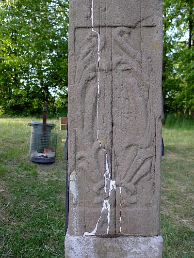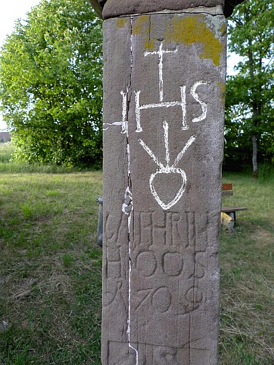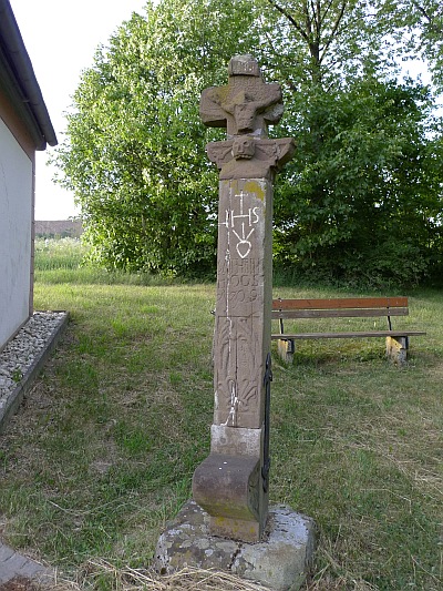 Nördlich des Ortes, an der Straße nach Pintesfeld bei der Kreuzwegkapelle. Unvollständig erhaltener Kreuzigungsbildstock von 1709. Der Schaftfuß mit kleiner Konsole der glatten Oberfläche zufolge erneuert. Die Vorderseite des geraden Schaftes in der unteren Hälfte in flachem Relief mit Blattwerk verziert, am oberen Ende das IHS-Zeichen und ein Herz mit drei Nägeln, darunter die eingeritzte Inschrift CATHRIN HOOS und die Jahreszahl. Am seitlich auskragenden Basisstein für die Kreuzigungsgruppe, von der nur das schwer beschädigte Kruzifix erhalten ist, ein stark plastischer Totenschädel in einfacher Steinmetzarbeit. [1]