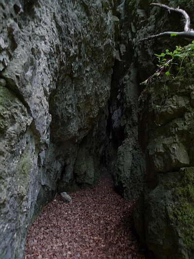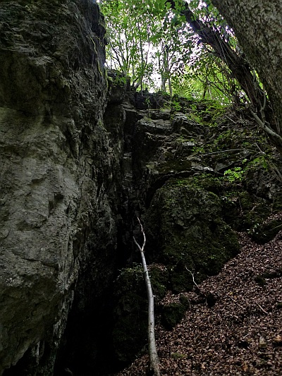 Steil stehende Kluft die durch Wasser auf Meterbreite ausgespült wurde.