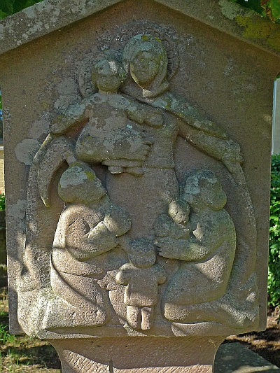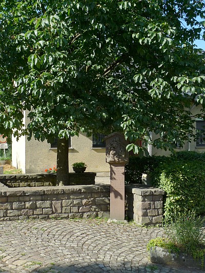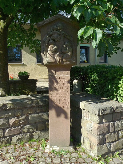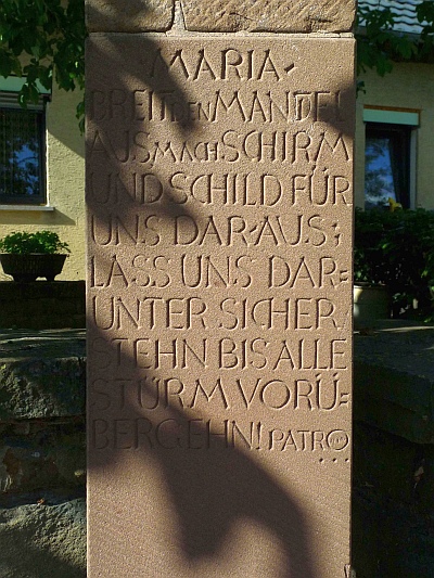 [...] Nur wenige Schritte weiter an einer Straßenecke stand vor dem zweiten Weltkrieg ein Barockkreuz mit einer Heiligenfigur. Es stammt aus dem Jahre 1878. Von diesem Kreuz ist nach dem Krieg nur noch der Sockel erhalten, auf den man 1951 auf einem vierkantigen Schaft einen eine Mantelmadonna darstellenden Bildstock setzte: das "Marienkreuz".
