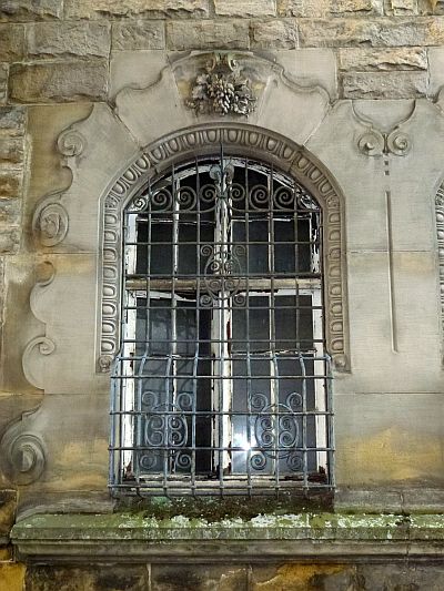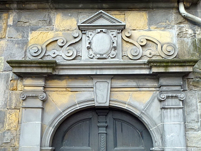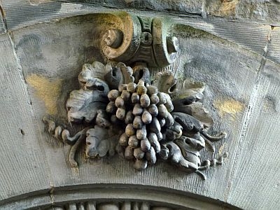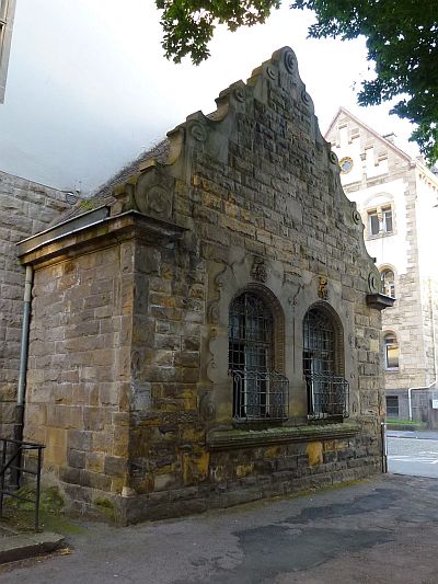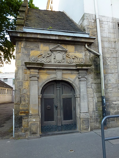 [...] Einen malerischen Akzent an der Straßenfront setzt das kleine östliche Eingangstreppenhaus: In der mit Jugendstilanklängen durchsetzten Formensprache der deutschen Renaissance errichtet, erhält der Baukörper sein eigenwilliges Gepräge durch eine Sandsteinrustizierung und durch ein reiches Volutenwerk am Aufsatz des Pilasterportals, am Zwillingsfenstergewände und am Seitengiebel. [1]
