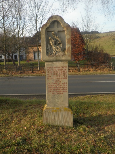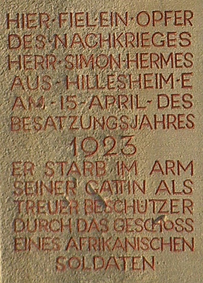 Der Bildstock an der Lindenstraße (oberhalb des oberen Kreisels rechts) wurde errichtet, (so ist es mündlich überliefert), weil an dieser Stelle Simon Hermes aus Hillesheim seine Ehefrau vor der Vergewaltigung durch einen französischen Soldaten (einer der gefürchteten Spahis) schützen wollte, wurde er von diesem erschossen.