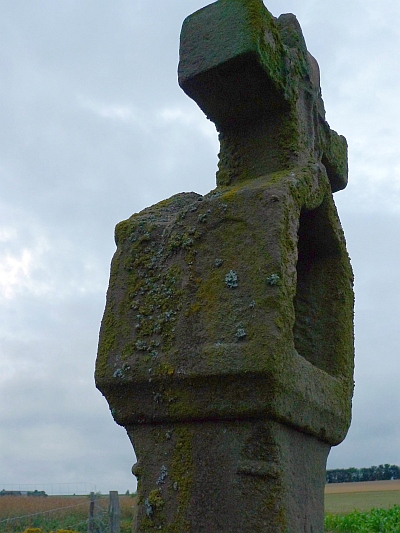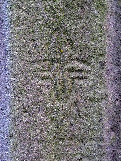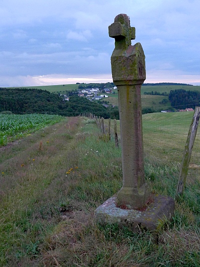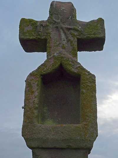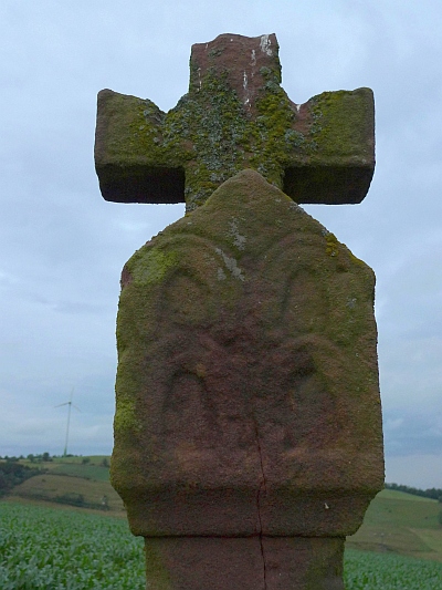 Nischenkreuz in altem Fundamentstein. Die Abfasung des schlanken, glatten Schaftes geht am oberen Ende mit abgesetzten, leicht ausgerundeten Schrägen in den quadratischen Querschnitt über. Das spitzgieblige Nischengehäuse mit tiefer, kielförmig schließender Nische. Die drei Außenseiten des Gehäuses in flachem Relief mit Blendbögen verziert. Das Abschlusskreuz mit kurzem Kreuzstamm, im Schnittpunkt von Stamm und Querbalken in flachem Relief wohl Leidenswerkzeuge, wegen der fortschreitenden Verwitterung nur noch ein Hammer zu erkennen, die Kreuzkontur mit begleitender Ritzlinie. Entstehungszeit wohl erste Hälfte des 17. Jahrhunderts. [1]