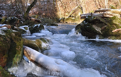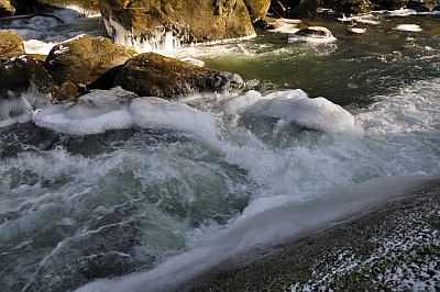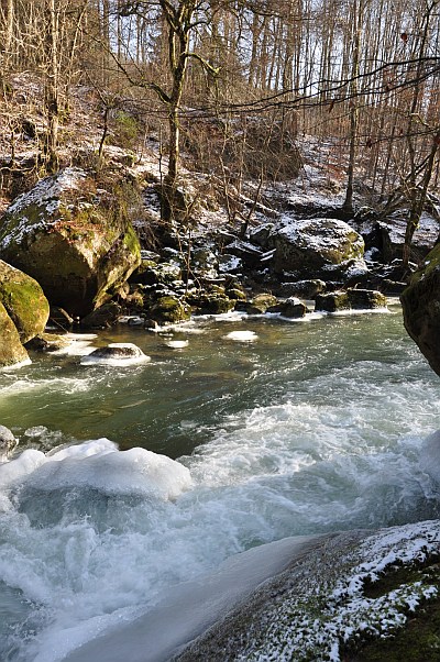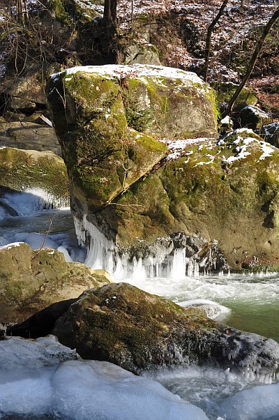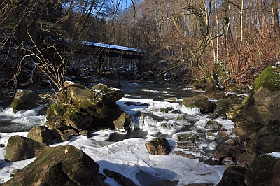 Diese im Volksmund als "Wasserfälle" bezeichneten Stromschnellen sind in der letzten Eiszeit durch herabstürzende Felsmassen entstanden. Die sonst gemächlich dahinfließende Prüm wandelt an dieser Stelle plötzlich ihr Gesicht: Von einer überdachten Brücke aus lässt sich das tosende Wasser beobachten, das sich hier einen Weg durch die bemoosten Steine und großen Felsinseln bahnt - ein einzigartiges Naturschauspiel, wo selbst noch so selten gewordene Arten wie Eisvögel und Wasseramseln eine Heimat gefunden haben. [1]