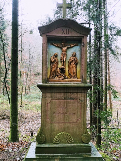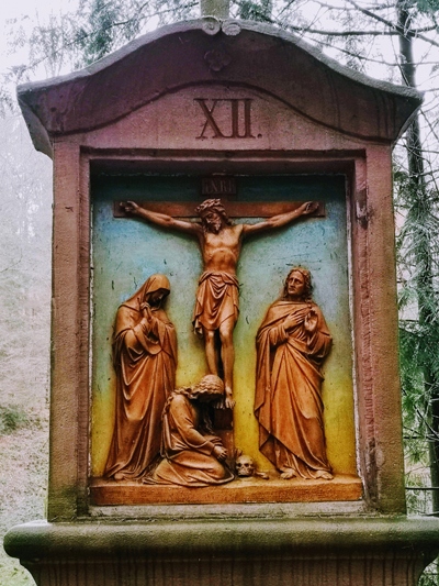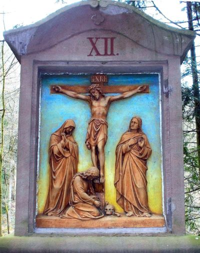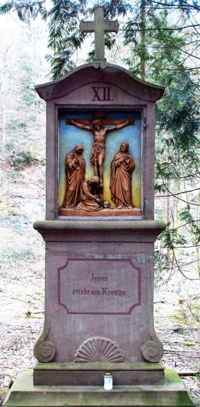 Der Stationenweg wurde 1899 anstelle eines 1857 genannten errichtet. Neubarocke, etwas über zwei Meter hohe übergiebelte Reliefnischen auf Pfeilern. Die Stationendarstellungen sind jeweils in flach- bis halbplastisch abgestuften Szenen herausgearbeitet. [1]