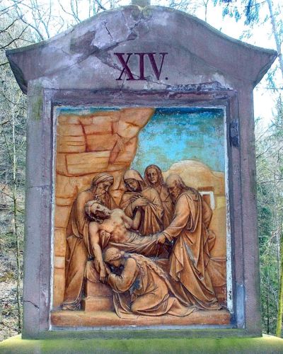 Der Stationenweg wurde 1899 anstelle eines 1857 genannten errichtet. Neubarocke, etwas über zwei Meter hohe übergiebelte Reliefnischen auf Pfeilern. Die Stationendarstellungen sind jeweils in flach- bis halbplastisch abgestuften Szenen herausgearbeitet. [1]