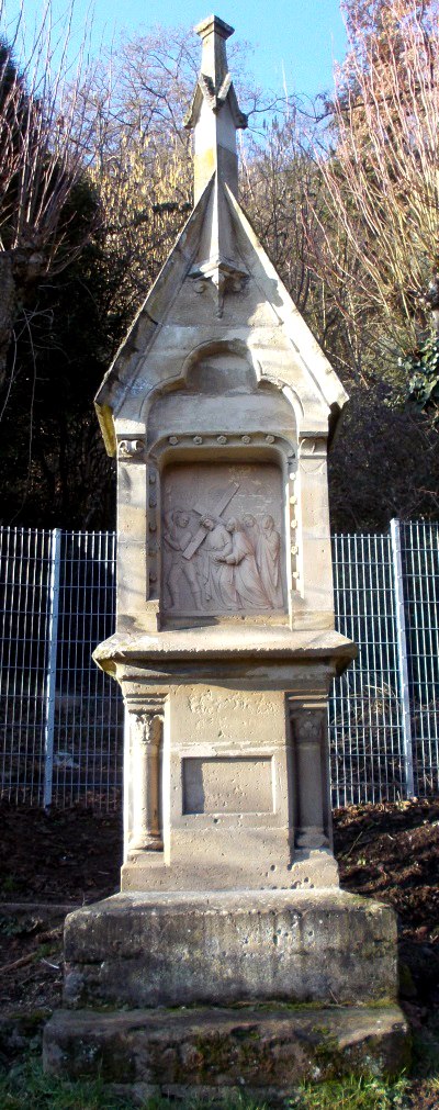 Neugotische altarartige Bildstöcke aus hellem Sandstein mit Mensa mit säulenbewehrten Kanten, in eine Dreipassblende eingelassene Tonreliefs mit nazarenischem Duktus, abgeschlossen von steilem Giebeldach mit diagonal gestellter Mittelfiale, die beschädigten Reliefs 2001/02 mit Hilfe der Trier-Gesellschaft e. V. wiederhergestellt.