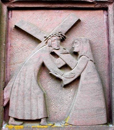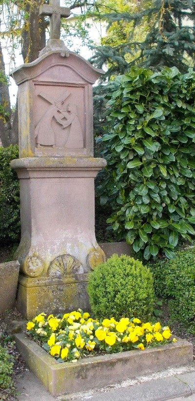 4. Station: Jesus begegnet seiner betrübten Mutter. Die 14 Stationen sind gleichartige neubarocke Sandsteinpfeiler mit segmentartig geschlossenen Rahmungen für erneuerte Reliefplatten. [1]