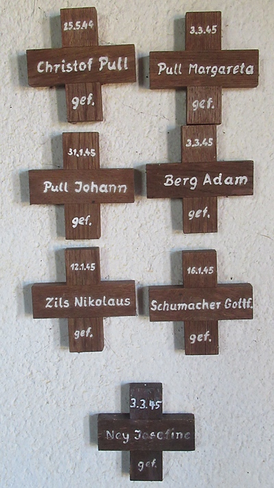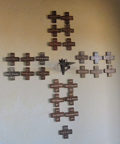 Die Kapelle soll auch zugleich eine würdige Gedächtnisstätte für die Gefallenen und Vermissten der beiden Weltkriege sein, 46 Holzkreuze an den Innenwänden tragen ihre Namen. [1]