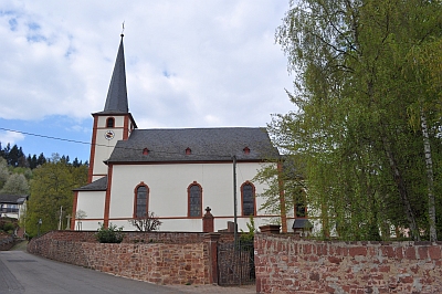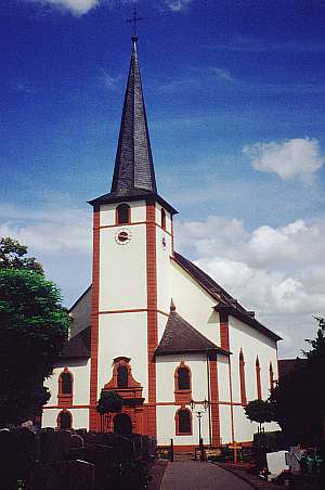Die Kirche erscheint in den Steuerlisten des 14. Jahrhundert und im Visitationsprotokoll des Jahres 1569. Der vom Abt Michael Hormann von Echternach errichtet Neubau ist einschiffig, nach Zahlen am Portal und auf der Innenseite des Triumphbogens vom Jahr 1755/56. Dreiseitig geschlossenes Chorhaus (1761 fertiggestellt) und Westturm. Das Innere ist rippenlos kreuzgewölbt. Die drei Säulenaltäre stammen wie die Kanzel aus der Erbauungszeit. Ein neues Altarblatt für den Hochaltar malte 1837 Franz Dausch in Trier. Ein Taufstein in Becherform entstammt ebenfalls dem 18. Jahrhundert. Orgel um 1900 in barocken Formen. [2]