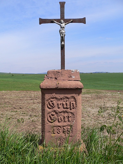 An der Landesstraße 16 Richtung Manderscheid, ca. 250 m hinter dem Ortsausgang, befindet sich ein Sandsteinkreuz mit der Aufschrift "Grüss Gott - 1875". Ehemals trug das Kreuz wohl ein Kreuz aus Sandstein, dass durch ein eisernes Kreuz ersetzt wurde. Es könnte sich um ein Unfallkreuz handeln. Nähere Umstände der Errichtung sind nicht bekannt. [1]