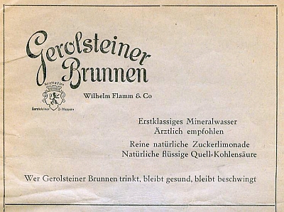 1907 wurde das Unternehmen von Wilhelm Flamm gegründet. Gesellschafter waren bis 1920 Moog und Bürgermeister Vogler. Nach dem Tode des Betriebsgründers 1945 ging die Geschäftsführung über in die Hände der Erbengemeinschaft W. Flamm. 1953 wurde zwar noch die "Hahn-Quelle" erbohrt, aber das konnte nicht verhindern, daß der "Gerolsteiner Sprudel" 1954 den Betrieb aufkaufte.