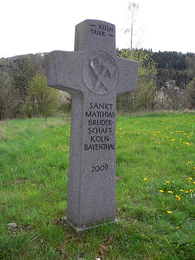 Jährlich gehen 80 Pilger den 210 km langen Weg. Das Kreuz wurde 2009 von der Bruderschaft aufgestellt, weil sie seit 25 Jahren auf dem Weg von Köln zum Apostelgrab nach Trier diesen Weg gehen. Das Kreuz aus Basalt schuf der Bildhauer Dieter Heuft. Ein geschwungener Pilgertab gekreuzt mit einer Axt (Axt =Zeichen des heiligen Matthias) zieren die Kreuzmitte. [1]