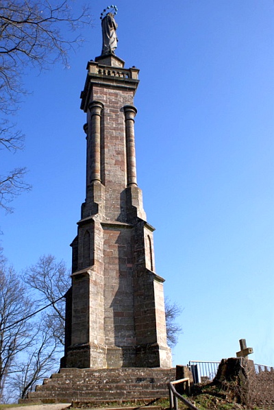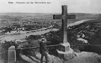 Auf dem Gelände der Mariensäule stand [...] bis zur Erbauung der Säule ein älteres, kleines Steinkreuz, zuletzt 1849 erneuert. Hier ließen die Trierer Metzgerzunft sowie die Wollweberzunft alljährlich am ersten Donnerstag in der Fastenzeit ein brennendes Rad den Steilhang hinunterrollen. Sollte das Rad in die Mosel stürzen, spendierte der Trierer Kurfürst angeblich den Zünften ein Fuder Wein. Aus diesem Grund hieß das Kreuz 'Metzgerskreuzchen'. Das Metzgerskreuzchen mußte dem Bau der Mariensäule weichen. Als Ersatz ließ das Baukomitee der Säule ein neues, das heutige 3,50 m hohe Sandsteinkreuz dicht an der Abhangkante errichten. Seine Inschrift erinnert an die Einweihung der Mariensäule 1866. [1]