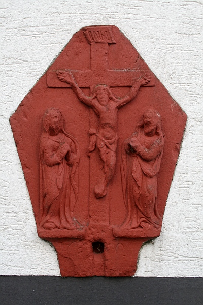Eingelassen in die Hauswand befindet sich ein gut erhaltener Bildstock, der den Gekreuzigten zeigt, begleitet links und rechts von 2 Figuren. Ob es sich dabei um Johannes und die Mutter Maria handelt, ist nicht eindeutig erkennbar, aber anzunehmen. Am unteren Ende des Bildes ist eine quadratische Öffnung, die darauf hindeutet, dass der Bildstock ehemals auf einem Unterteil (Stock) stand. [1]