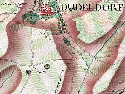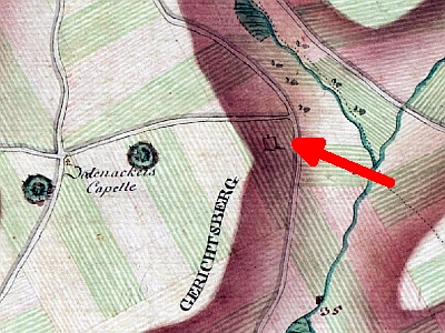 Dort zeigen sogar zwei Bezeichnungen auf den Standort des Galgens hin. Zum ersten der sogenannte Gerichtsberg und in unmittelbarer Nähe zeichnet Ferraris die Dodenakerskapelle.. [1] [2]