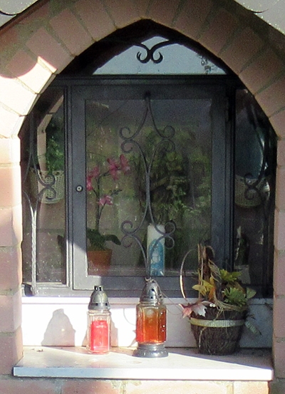 Im Inneren der Nische Muttergottes-mit-Kind-Figur, Glasscheibe und Ziergitter davor. [2]