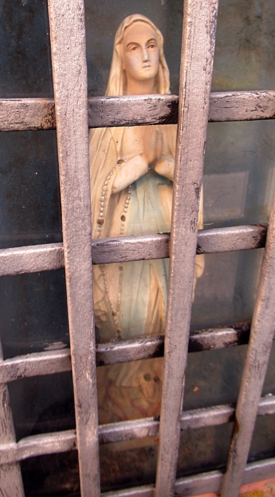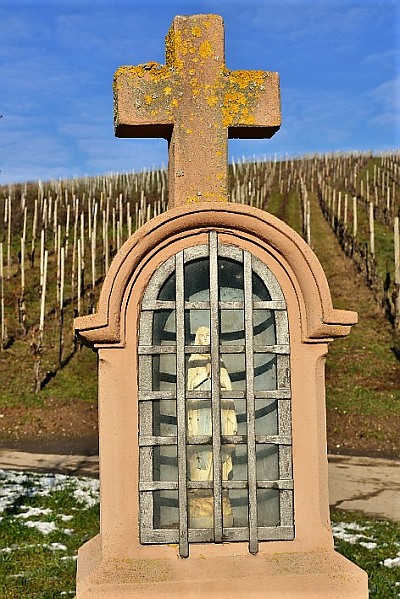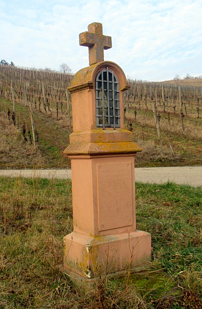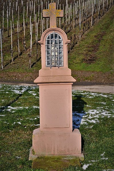 Sandsteinkreuz mit Nische, vergittert. In der Nische eine kleine Muttergottesstatue. Am Schaft Schrifttafel mit verwitterter, unleserlicher Inschrift. [1]