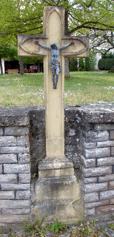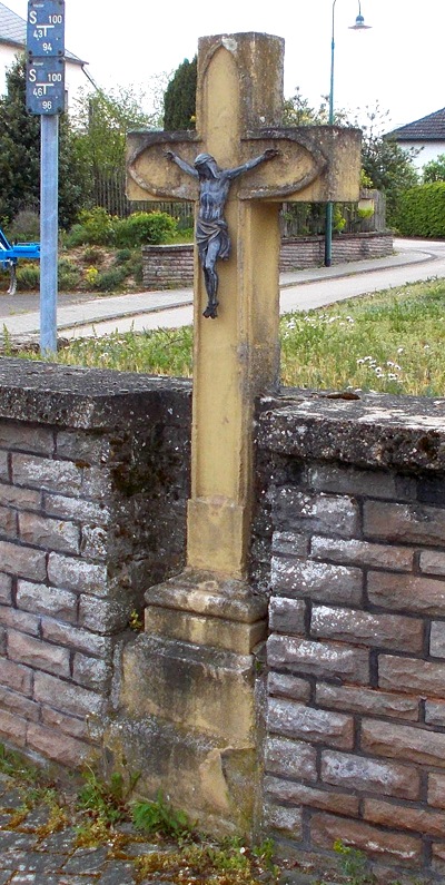 Steinernes Wegekreuz, in Ummauerung eingefügt. [1]