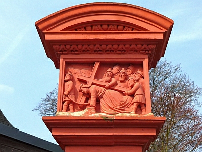 Die "sieben Fußfälle" als Urform des Kreuzwegs wurden im 17. Jahrhundert vermutlich unter dem Domvikar Anton Wiltz angelegt. Einige der Stationen, die sich im Besitz der Pfarrgemeinde von Heiligkreuz befinden, wurden 1850 durch den Trierer Bildhauer Georg Leonardy überarbeitet oder erneuert.