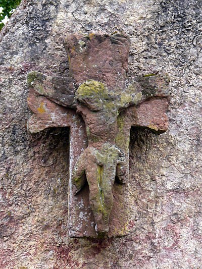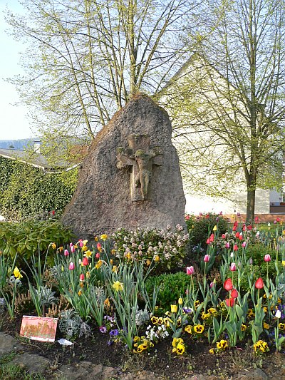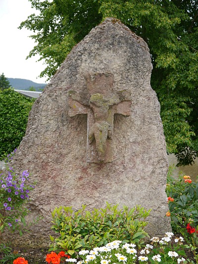 Abzweigung Hauptstraße / Gerolsteiner Straße. Auf einem Basaltblock wurde das Kreuzfragment aus Sandstein mit einem großen Christuskorpus eines früheren großen Wegekreuzes angebracht. Gut möglich, dass dieses Kreuz an der Stelle stand, an der die Hauptstraße am Dorfeingang begann.