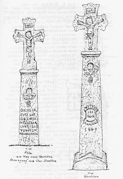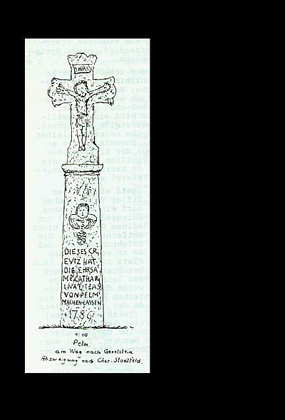 "Dieses Creutz hat die Ehrsame Catharina Uters von Pelm machen lassen 1786". Es scheint vom gleichen Meister gearbeitet zu sein. Das Kreuz steht an der Gerolsteiner Straße, nahe der Abzweigung nach Gees. [2]