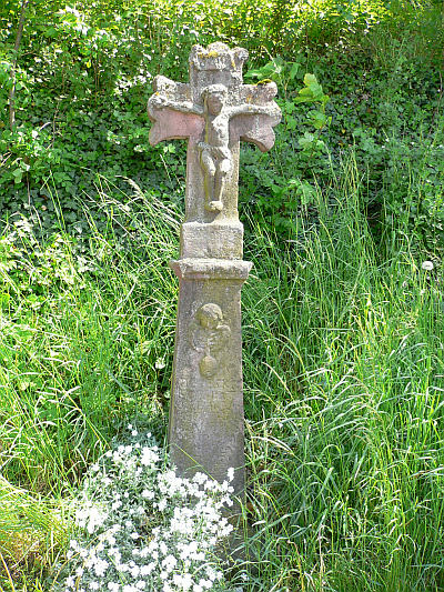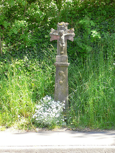 Das Kreuz [Sogenanntes Schmitze Krejz, am Brunnenplatz in Gerolstein Red.] ähnelt sehr einem Kreuzbild in Pelm, das die gleichen barocken Formen, einschließlich Engelskopf zeigt. Die Kreuzbalken sind als Tatzenkreuz dreifach ausgezogen. Ein Grund für die Errichtung ist nicht bekannt. Es trägt die Inschrift: