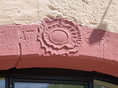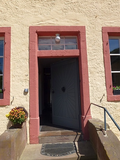 Traufständiges Quereinhaus zwischen der Kirchhofstützmauer und der Marienstraße, 1786 durch den Baumeister Leblanc unter Einbeziehung einer älteren Scheune erbaut. Der Wohnteil symmetrisch in fünf Achsen gegliedert, die Haustür in der Mittelachse trägt im Sturz die Jahreszahl 1786 in römischen Ziffern; der gegenüber den bäuerlichen Wohnhäusern höhere Anspruch an Repräsentation zeigt sich auch in der frühen Verwendung der großen Rechteckfenster. Am Wirtschaftsteil korbbogiges, 1764 datiertes Scheunentor, das Wohngeschoß über der Scheunentenne wurde erst zwischen den beiden Weltkriegen eingezogen.
