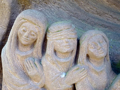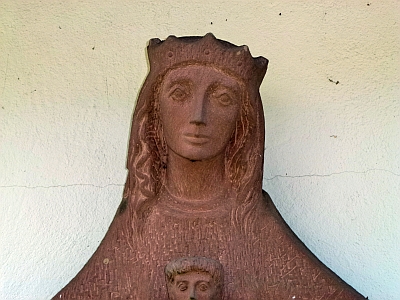 Der Bildstock der Schutzmantelmadonna wurde im Jahre 1965 errichtet. Die Madonna umarmt die drei Jungfrauen mit ihrem Esel und die Pilger, die von weit herkommen, um in Auw in der Kirche zu beten und der Mutter Gottes Opfer zu bringen. [1]