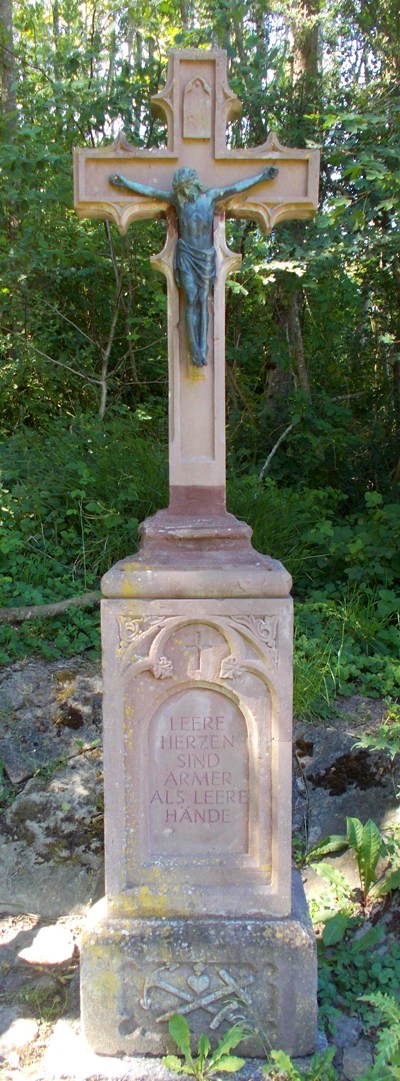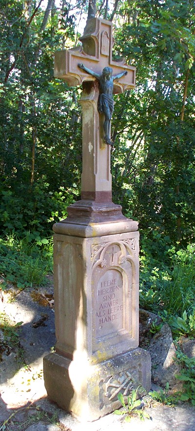 Steinernes Wegekreuz mit Sockel und kurzem Schaft, verziert.