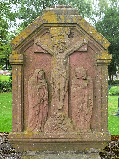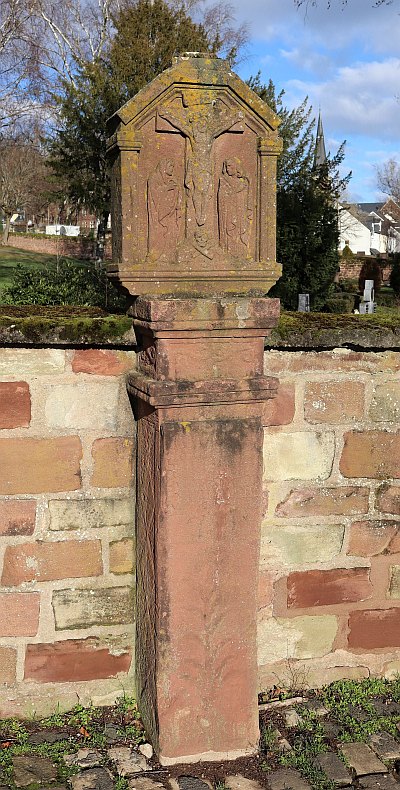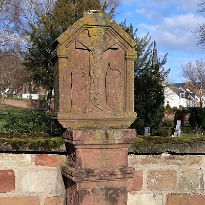 darüber flaches Relief mit Kreuzigung mit Maria und Johannes. Zeugnis der Volksfrömmigkeit. [1]
