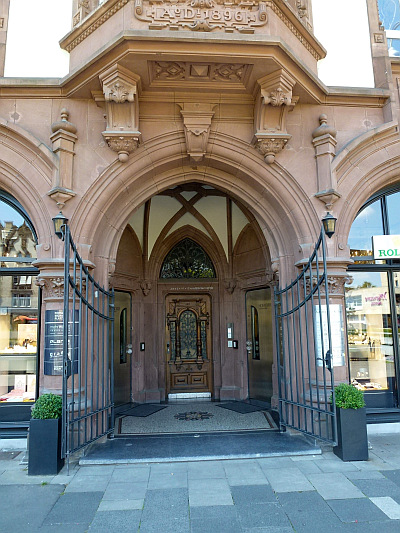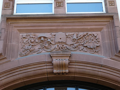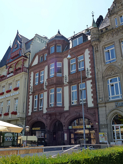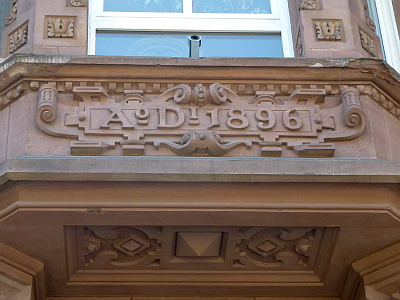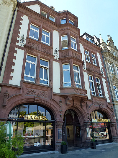 Dreigeschossiges Wohn- und Geschäftshaus; sandsteingegliederte Putzfasade mit neugotischen und neubarocken Motiven, 1896. [1]