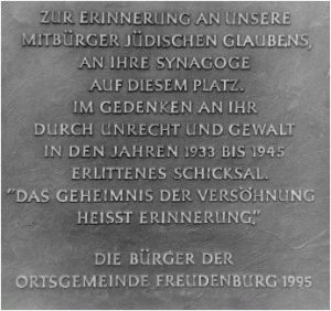 Im Herbst 1994 beriet der Freudenburger Gemeinderat über den Tagesordnungspunkt Bodendenkmal ehemalige Synagoge; Errichtung einer Gedenktafel. Ortsbürgermeister Braunshausen begründete den Antrag, in dem er anführte, daß viele Bürger nach Veröffentlichung des Buches Vergessene Zeugen und der Kundgebung auf dem jüdischen Friedhof ein sichtbare Zeichen der Erinnerung und des Gedenkens an ihre ehemaligen jüdischen Mitbürger setzen wollten. Hierfür gebe es keinen besseren Ort als den früheren Standort der Synagoge in der Mitte des Ortes, zumal der Gemeinderat dadurch einen Beschluss von 1962, die Reste der Synagoge abzureissen zwar nicht rückgängig machen, in gewisser Weise aber relativieren könne. Der Antrag wurde so angenommen. Am 31.01.1995 wurde der Beschluss gefasst, auf dem Platz der ehemaligen Synagoge ein Denkmal mit einer Bronzetafel zu errichten. Das Denkmal wurde am 02.02. 1995 feierlich enthüllt. Zu diesem Anlass gedachte dei Ortsgemeinde Freudenburg ihrer ehemaligen Mitbürgerinnen und Mitbürger jüdischen Glaubens, die in den Jahren von 1933 bis 1945 ins Exil getrieben, deportiert und ermordet wurden. Der persönlichen Einladung der Ortsgemeinde waren mehr als 30 in Freudenburg geborene jüdische Mitbürgerinnen und Mitbürger beziehungsweise ihre Nachkommen aus Israel, den USA, vor allem aber aus Frankreich und Luxemburg gefolgt. [1]