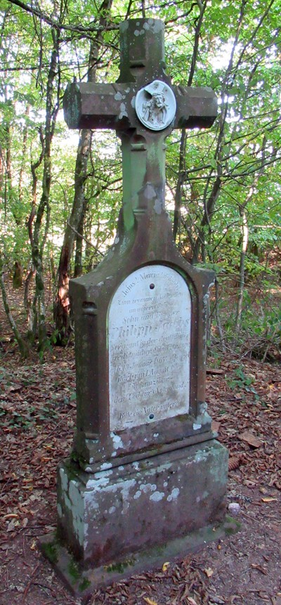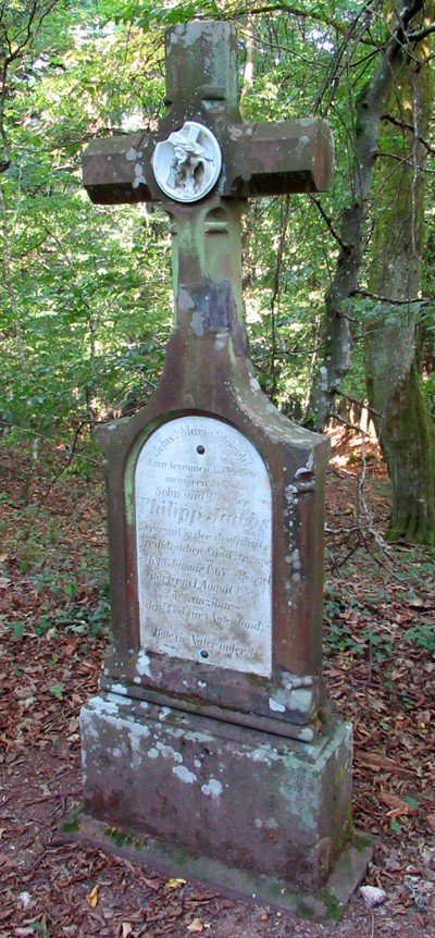 Schaftkreuz/Schrifttafel in Grabsteinform.