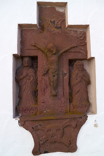 unter dem Kreuz links der Apostel Johannes, rechts die Mutter Maria. Der Totenkopf mit den gekreuzten Knochen weist das Kreuz als Totenkreuz aus. Es stand wohl früher auf dem Grab des Priesters Matthias Kremer. Das untere Kreuzteil ist zerstört worden. In die Mauer der Taufkapelle, unterhalb des Kreuzrestes, wurde eine Tafel mit der Inschrift:
