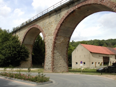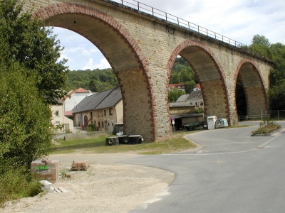 Mit fünf großen Bögen überspannt die Eisenbahnbrücke das Tal des Essebachs zwischen Menningen und seiner Einmündung in die Prüm.