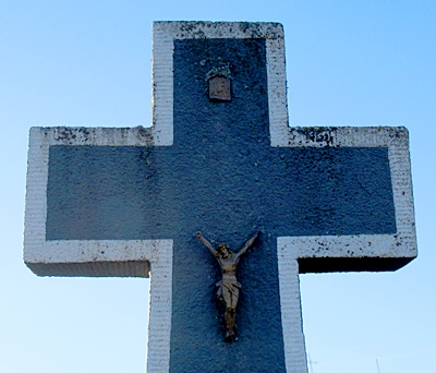 Balkenkreuz aus grauem Terrazzo, mit kleinem Eisenkorpus.