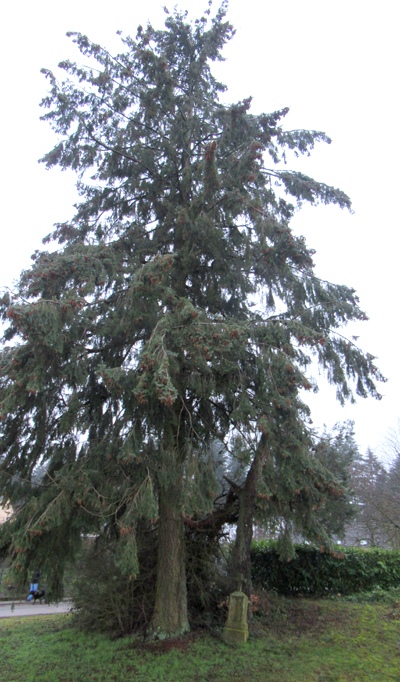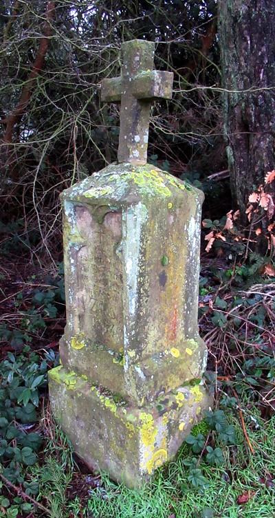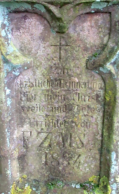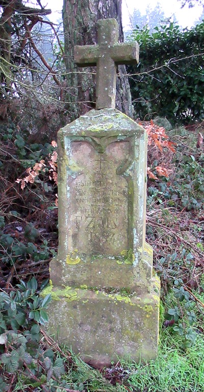 Pfeilerschaftkreuz/Schrifttafel aus Sandstein, verwittert, unter einer mächtigen Tanne gesetzt.