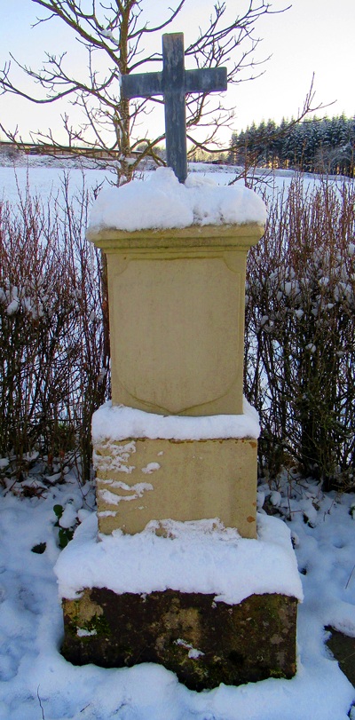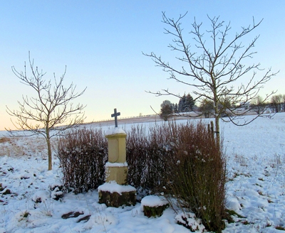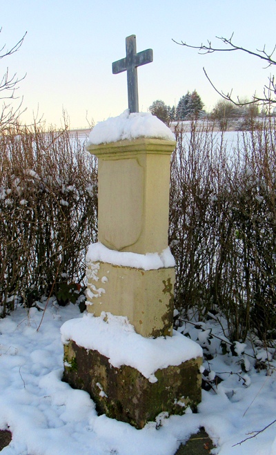 Pfeilerschaftkreuz aus hellem Sandstein, Kreuzabschluß aus Metall.