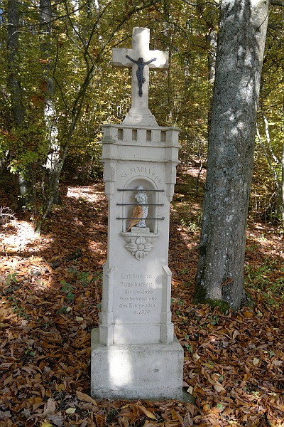 Das dem Waldstück "Am Kreuzchen" seinen Namen gebende Wegemal ist sehr aufwändig gearbeitet und stand nicht immer so versteckt wie heute, denn früher führte der Weg nach Mesenich und Langsur direkt vorbei.