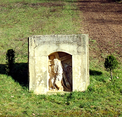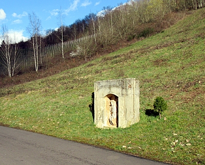Nischenbildstock aus Sandstein, leicht verwittert. Eventuell Kreuzwegstation 2 - "Jesus hat das Kreuz auf seine Schultern genommen".
