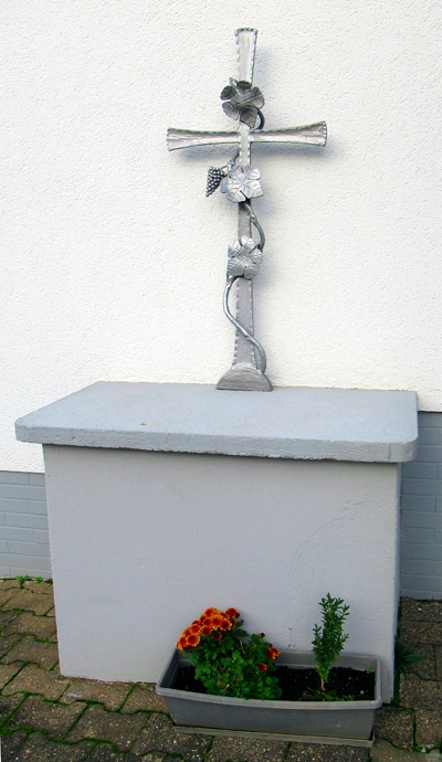 Altarkreuz, Altartisch direkt an Hauswand angesetzt, mit Blumendekor verziertes Metallkreuz. [1]